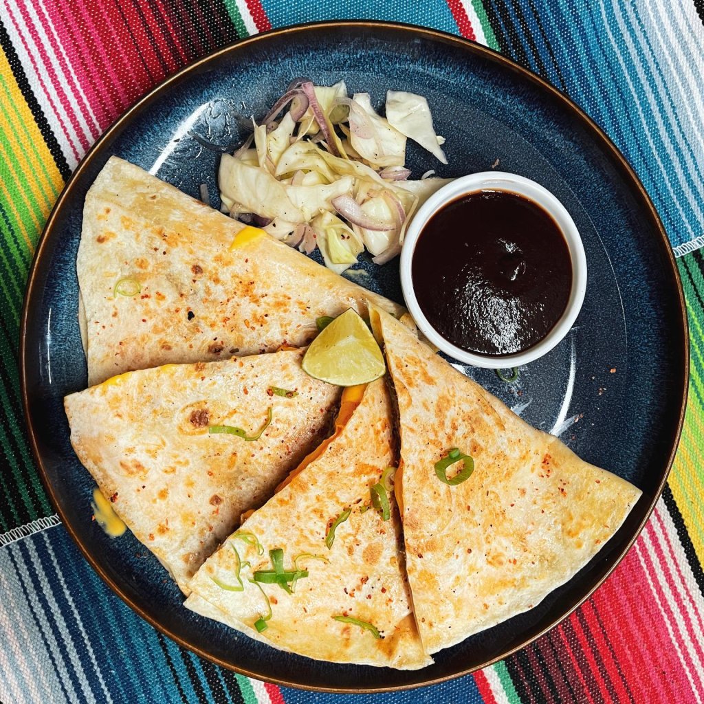 Zapečená tortilla s pikantní chipotle omáčkou, BBQ, sýrem, kuřecím trhaným masem a salátkem pico de gallo