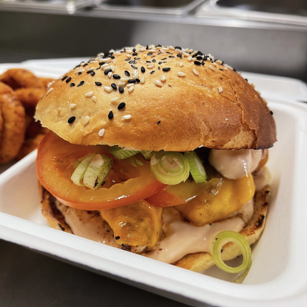 Naše domácí bulka, olé majonéza, rajče, slanina, kuřecí stripsy na přírodno, jarní cibulka