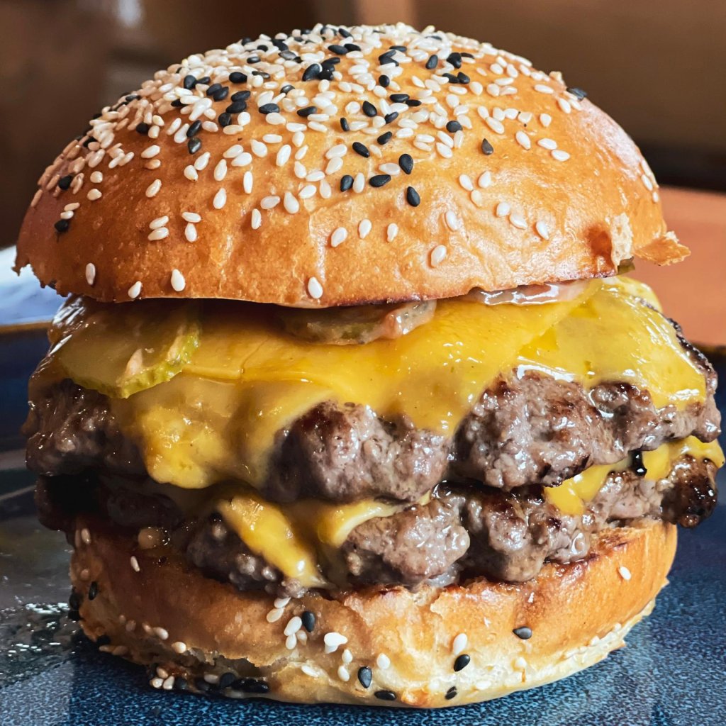 Double hovězí maso, double čedar, kečup, hořčice, cibule, nakládaná okurka