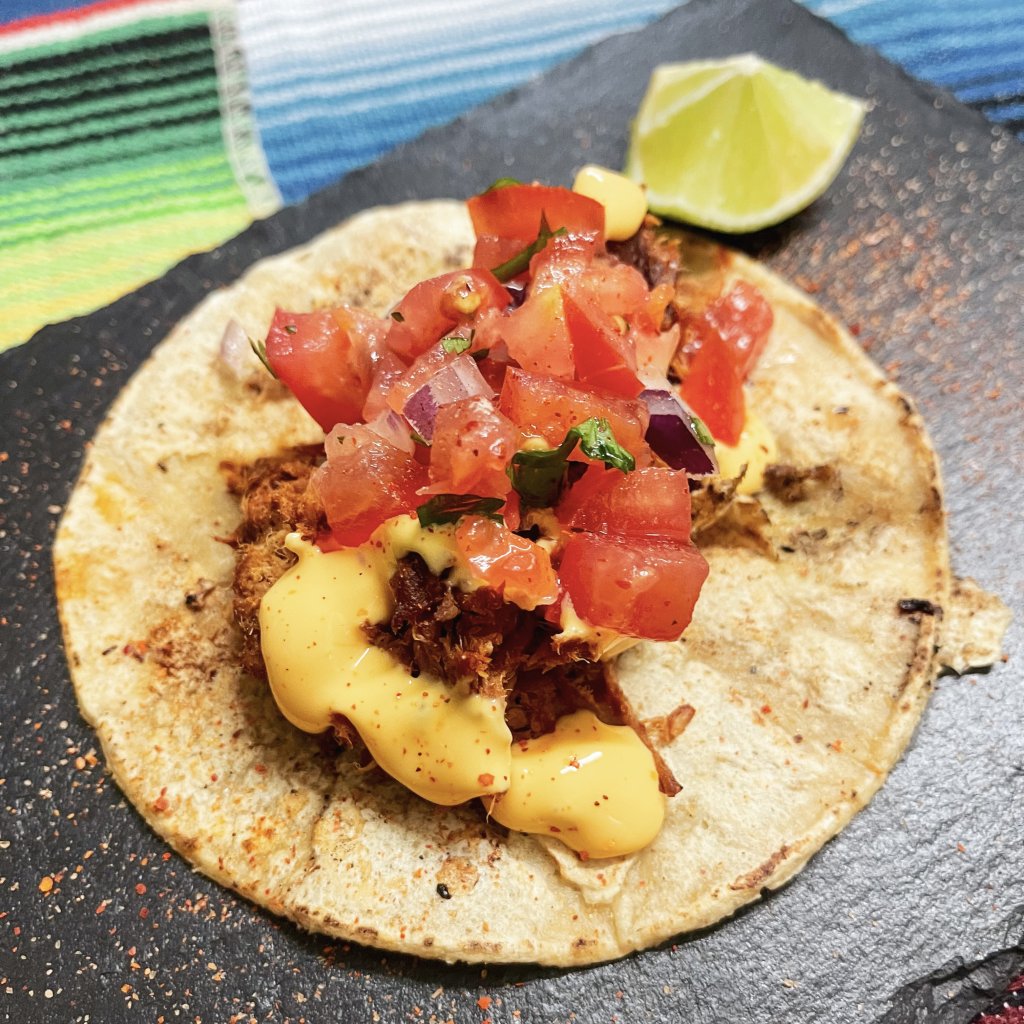 Kukuřičná tortilla s trhaným vepřovým masem, salátkem pico de gallo a čedarovou omáčkou