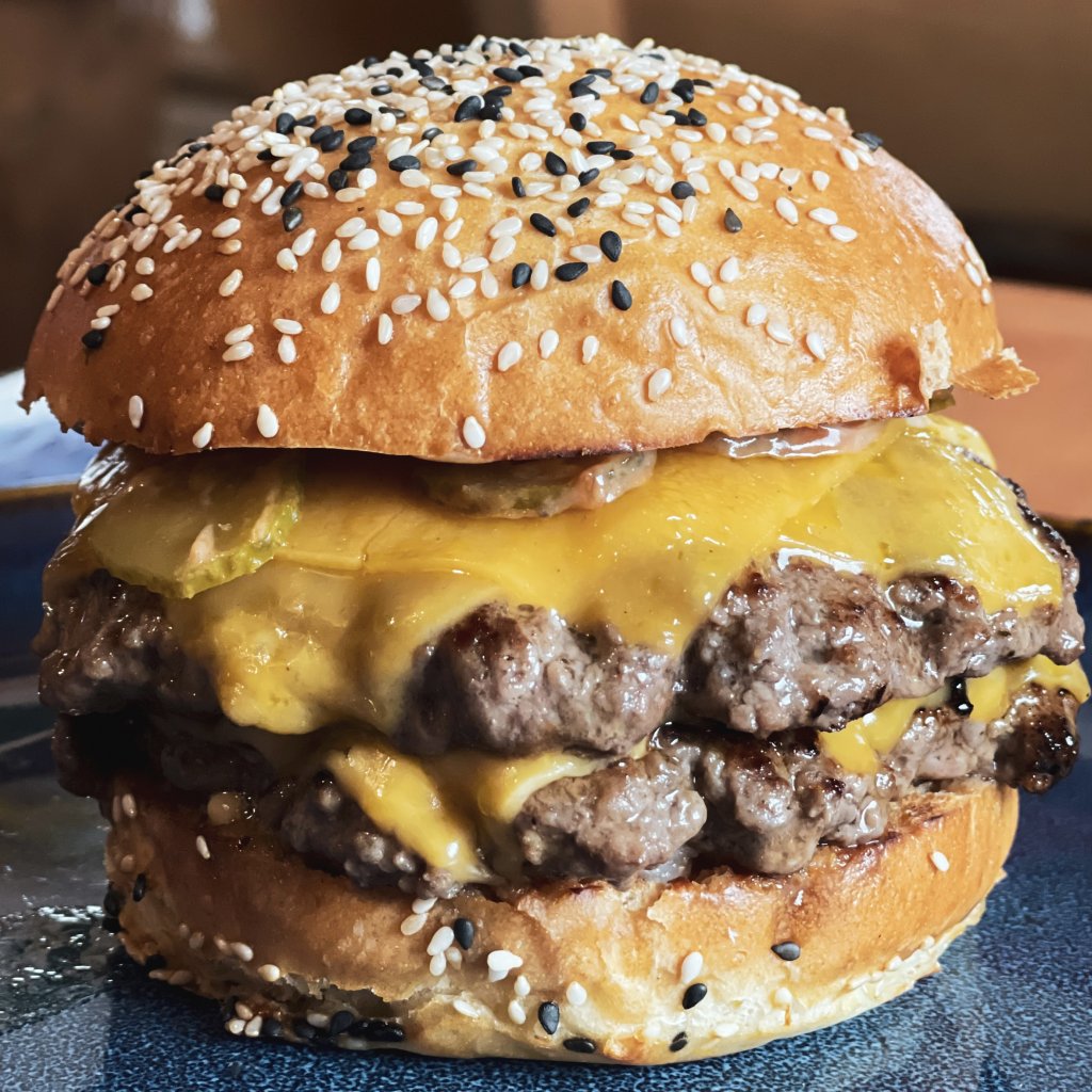 Bulka, kečup, hořčice, double hovězí maso, double čedar, nakládaná okurka, cibule