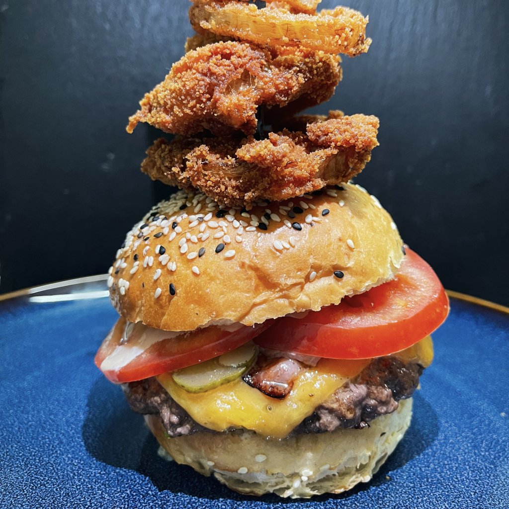 Hovězí maso, čedar, slanina, rajče, nakládaná okurka, červená cibule, sladko-kyselá omáčka, domácí cibulové kroužky