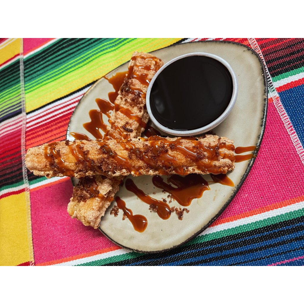 Originální mexický dezert. Smažené tyčinky se skořicovým cukrem, karamelem a sladkou omáčkou.