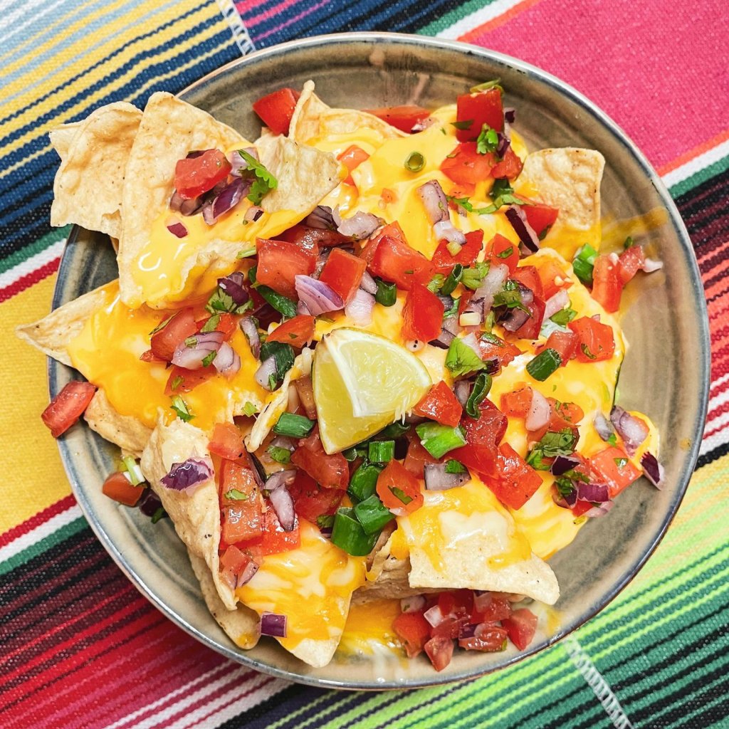 Nachos - kukuřičné bezlepkové chipsy se zapečeným sýrem a čedarovou omáčkou, salátek pico de gallo, jarní cibulka
